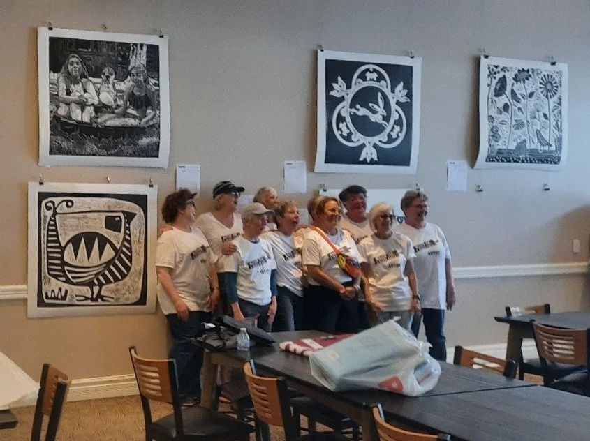 Our by-far-the-biggest project took place in July of 2023, when the group organized and hosted Mason, INK: the Mason, Michigan Big Print Event. Giant blocks of lino, 2 feet x 3 feet, were carved by our group and by prominent guest artists, then inked and printed in the street by driving an asphalt roller over them!